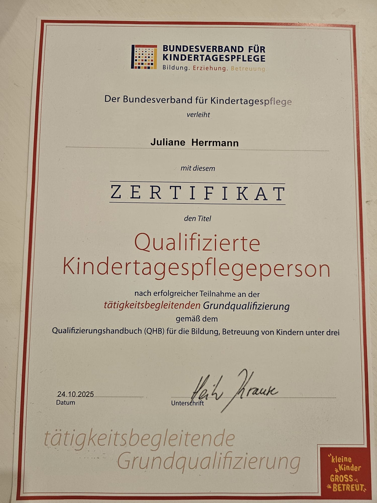 In der Kindertagespflege ist die pädagogische Qualifizierung der Betreuungsperson Grundvoraussetzung. Ich habe die höchstmögliche mit 300 Stunden nach QHB. Vom Jugendamt habe ich 2009 meine erste Pflegeerlaubnis erhalten. Seit dieser Zeit besuche ich mehrmals jährlich Fortbildungen, die mein Wissen in verschiedenen Bereichen der Kinderbetreuung immer wieder erweitern. Dazu zählen ständige Erste-Hilfe-Kurse, Kurse über kindgerechte Ernährung, Hygiene, Infektionsschutz, Kommunikation, Motorik, Stimmbildung, Spachbildung und-förderung, Musizieren, Umgang mit Konflikten, Kinderschutz oder auch Kurse zu neuen Koch-, Mal- und Bastelideen mit den Kindern.